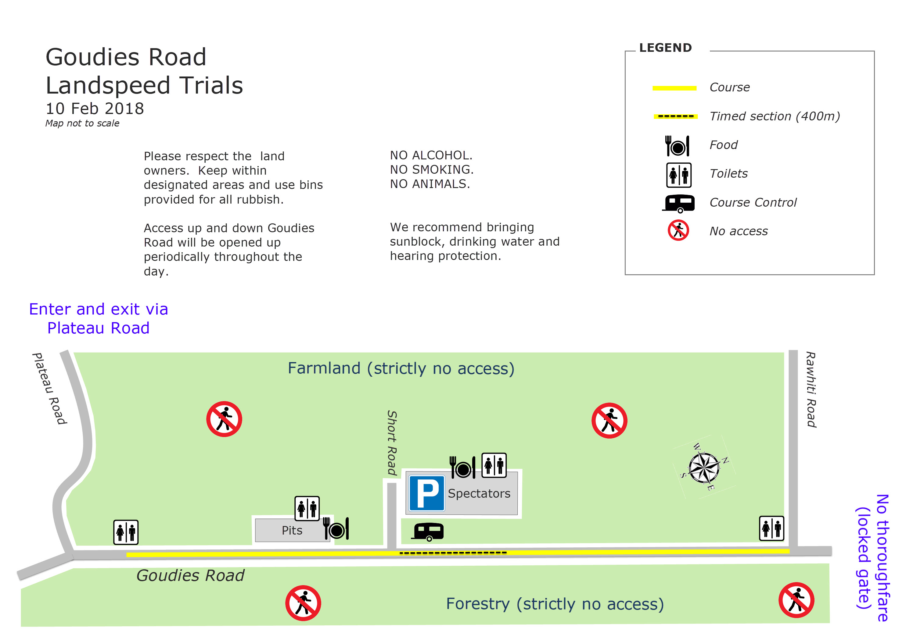 Please note that the northern end of Goudies Road is gated and LOCKED in the forest, there is no public access this way. Enter via Plateau Road, when you get to the end of Plateau turn left onto Goudies and then proceed 2.4 klms up to the pit entrance on your left. ( you will see a huge barn on the left). Participants must be in Pit area for Car/Bike check and safety gear check by 6.30am to 7am. If arriving after 8am then Goudies road will be closed, and you only option is via the 2klm unsealed dirt farm road entry from Plateau Road, 200 meters from junction of Goudies road. Proceed slowly and quietly 10kph max past the house on right, past the cowshed on left. If cows crossing or path closed wait until clear, close gates or cord across as you found it, then turn right and proceed for 2klms up to behind the big barn pit area. It will be sign posted. Public spectators, to left of pit area into paddock up to within 30 meters of Goudies road fence. IMPORTANT This is a motorsport event you enter at your own risk, that means you and your car. Motorsport could be dangerous. Recommended to wear ear protection.